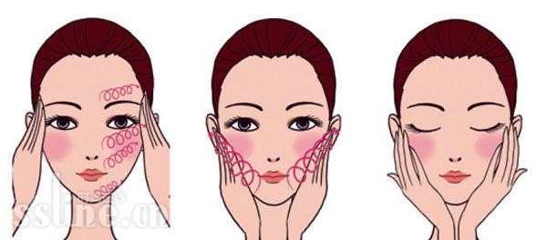 提拉面部线条:相比只用力揉搓皮肤表面,应该给手施加压力,按箭头方向按压至皮肤深处。