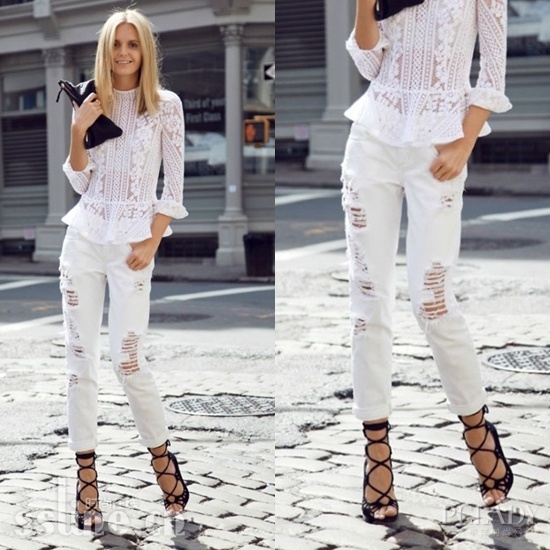 同样是做旧的白色牛仔裤,搭配蕾丝的上衣看起来中性中又透着性感和妩媚。