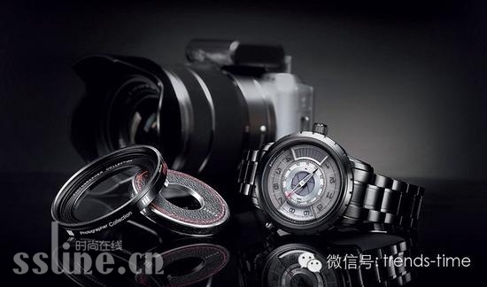 经过这几年在产品设计和市场宣传方面的不断深化,飞亚达已经形成了几大经典系列,摄影师就是其中的代表。它的设计灵感来源于摄影师的镜头,蕴含“用手表记录时间,用镜头记录生活”的寓意。今年推出的2014 限量款,除了基本概念不变之外,整个手表的外观向前进化了10 年。42 毫米的不锈钢表壳经过镀黑处理,表盘上只有一根指针指示秒钟,内外两层旋转盘,分别显示分钟(3 点位红色箭头)和小时(9 点位的扇形窗口)。最有意思的是,飞亚达将手表的表圈当成了真正的摄影镜头来处理,既可以给它安装上真皮质感的表盖,也可以将真正的微单相机的UV 镜和镜头盖固定在上面(通过10点位的按钮控制),解决了UV 镜和镜头盖无处安放的问题。在我看来,这个设计有点儿装那个啥—给表加个镜头盖还怎么看时间?不过长期以来国产表不是“装”得太多了,而是“装”得太少了。这也是种境界,不是谁都能做到。