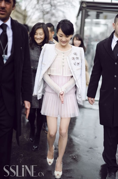 参加正式的时尚活动,粉色小礼服外搭白色粗花呢外套,脚踩白色的高跟鞋,秀出白皙的美腿,展现优雅妩媚的风情,在众人的簇拥下气质十足,气场全开。