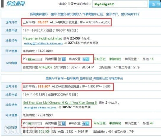 好在第三方平台不止一家,花个几十万就能被收买“造”出对比图的无节操平台毕竟是个例。记者通过多方途径验证该数据真实性,根据中文网站排名服务平台站长之家(www.chinaz.com)数据,在包含但不仅限于网站排名、官方网站PR值、百度权重、移动权重等多个指数的对比中,更美APP的表现都和截图中惨烈“趴在地上”的竞品出现了剧烈反转。