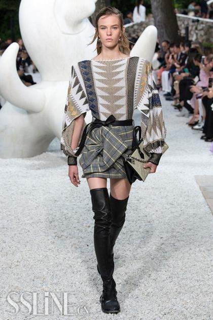 特意强调肩部轮廓的LV,让模特化身强有力的时髦女战士,突出宽肩和收腰设计,倒三角的服装廓形更是打造充满未来感的着装风格。