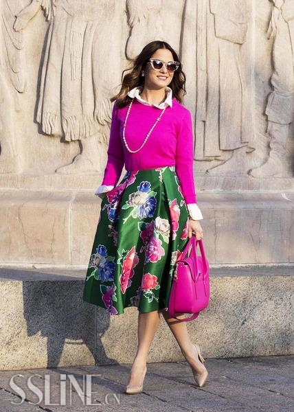 同样都是伞裙样式的印花半裙,只不过换了一种面料,换了件饱和度低的衬衣,带来的效果却是这样的高级。