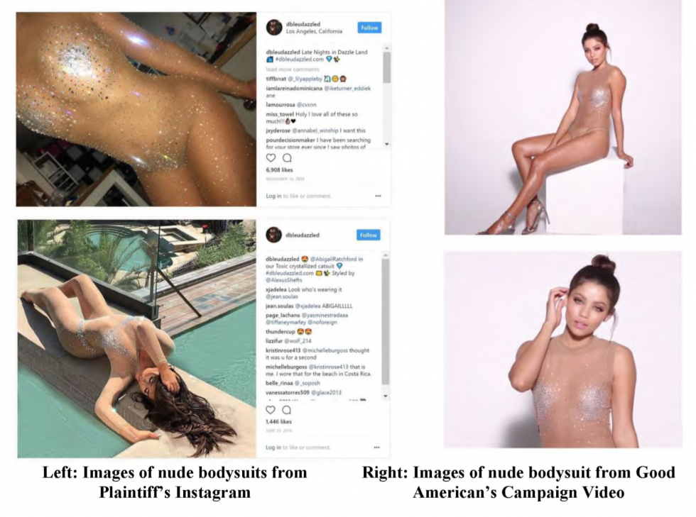 据法院材料显示,Khloe Kardashian在2016年和2017年期间曾要求其团队购买和借用大量d.bleu.dazzled的产品,随后Good American在2017年6月推出的多件产品与她购买的产品类似的设计——并带有水晶装饰的紧身裤。