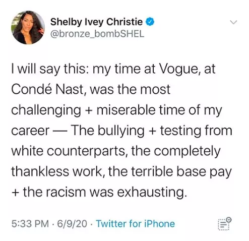 在Anna Wintour表示将尽快推出实质性计划以改善公司内部的多元化之后,该公司前员工Shelby Ivey Christie在社交媒体上表示,“在《Vogue》以及康泰纳仕集团的工作,是自己职业生涯中最具挑战性也是最痛苦的时光”,来自白人同事的欺凌让她感到精疲力竭。