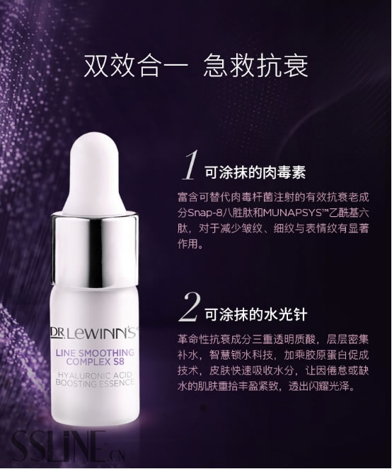 而莱文医生的新肌小安瓶之中,就同时含有了六胜肽(3% Munapsys™)和八胜肽(Snap-8™)两大成分,不仅可以强效抗皱,抚平皱纹,还可以促进胶原蛋白再生,焕活新肌。