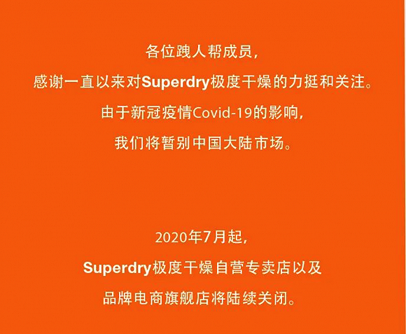 6月24日午时,Superdry正式宣布会在7月起陆续关闭自营店及品牌电商旗舰店。今后将通过品牌英国官网继续运营。同时,其“目娱乐节今日”会员俱乐部也会在6月24日起停止发放和使用消费积分等权益。已加入会员的剩余积分可在7月23日前从品牌会员微信商场、天猫旗舰店兑换商品。