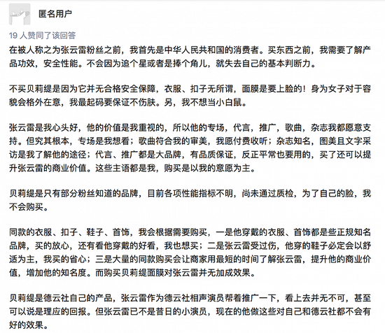 有匿名用户在知乎表示,自己是张云雷的粉丝,不买贝莉缇是因为品牌没有安全保障,“贝莉缇是只有部分粉丝知道的品牌,目前各项性能指标不明,尚未通过质检,为了自己的脸,我不会购买。”