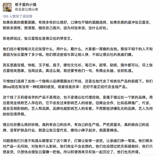 知乎用户“柜子里的小猫”则表示,如果德云社真的做自己的品牌,进军护肤品行业,让张云雷代言,自己愿意捧场,但德云社选择了一个微商品牌面膜打市场,“假如没有张云雷背书,你们敢买这个面膜吗?如果你们用了以后出问题,你们打算去找谁说理?如果这个面膜检查出问题,比如菌落总数超标什么的,谁对舆论负责?”