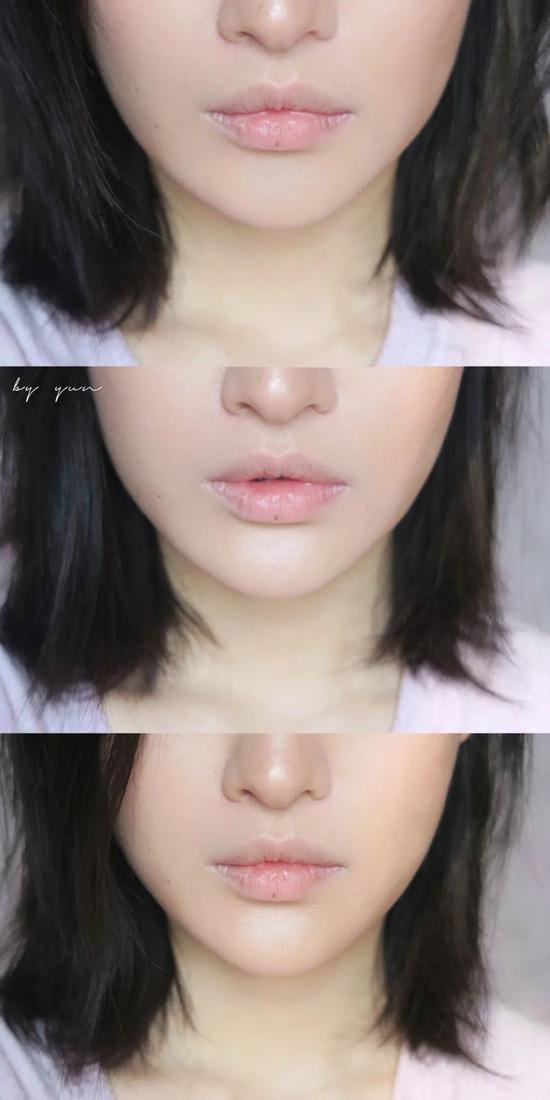 在下巴中心的位置纵向打哑光高光,降低下巴的视觉中心,从而拉长下巴的整体比例;然后在高光的两侧刷少许阴影粉,打造小巧玲珑的尖下巴。