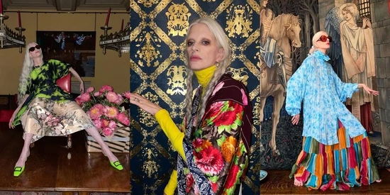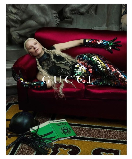顶级时尚品牌 Gucci 也邀请了这位在90年代大火的代表性超模参与拍摄 Gucci Aria 系列广告,让我们看见疯狂大胆的时尚奇想。